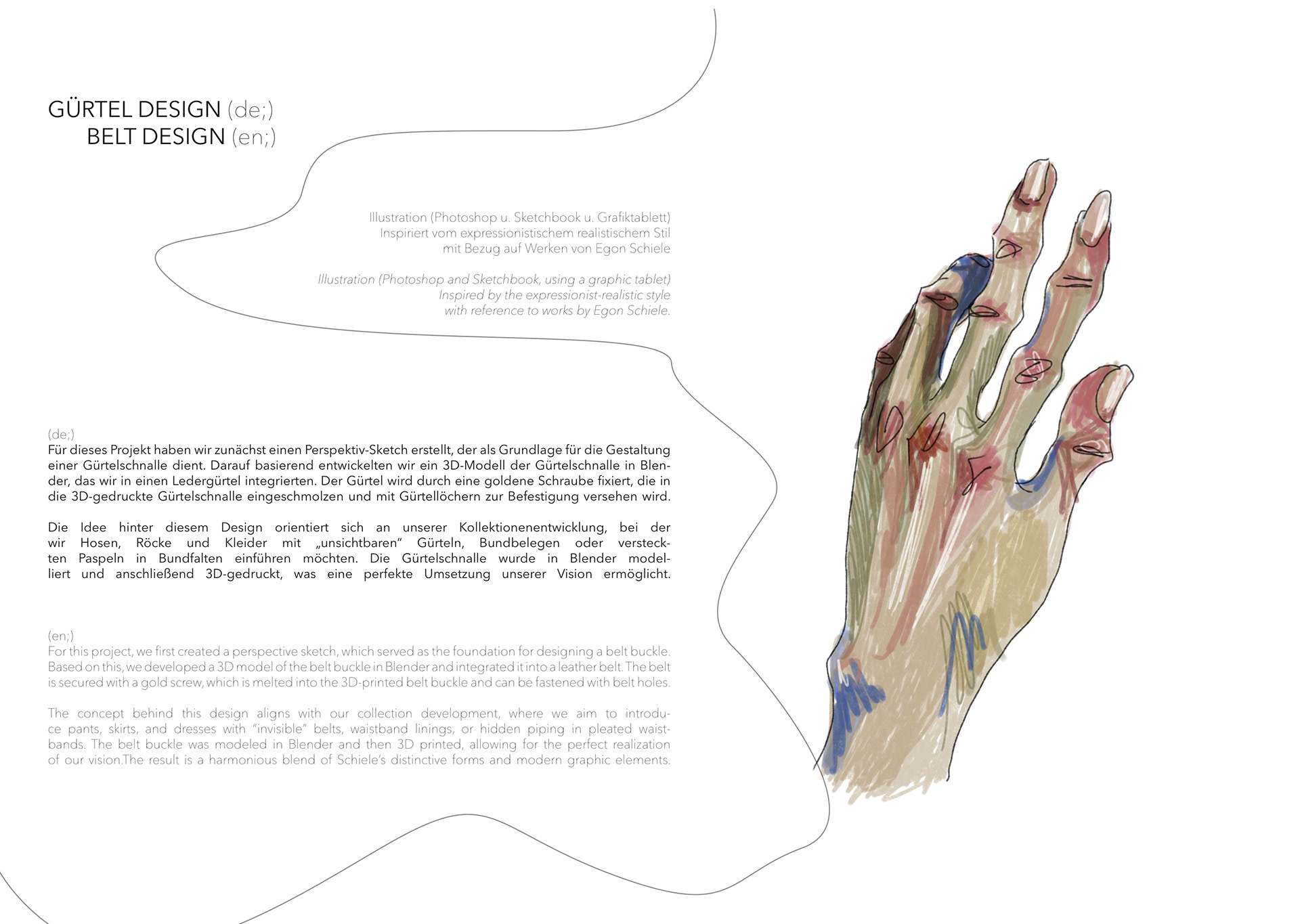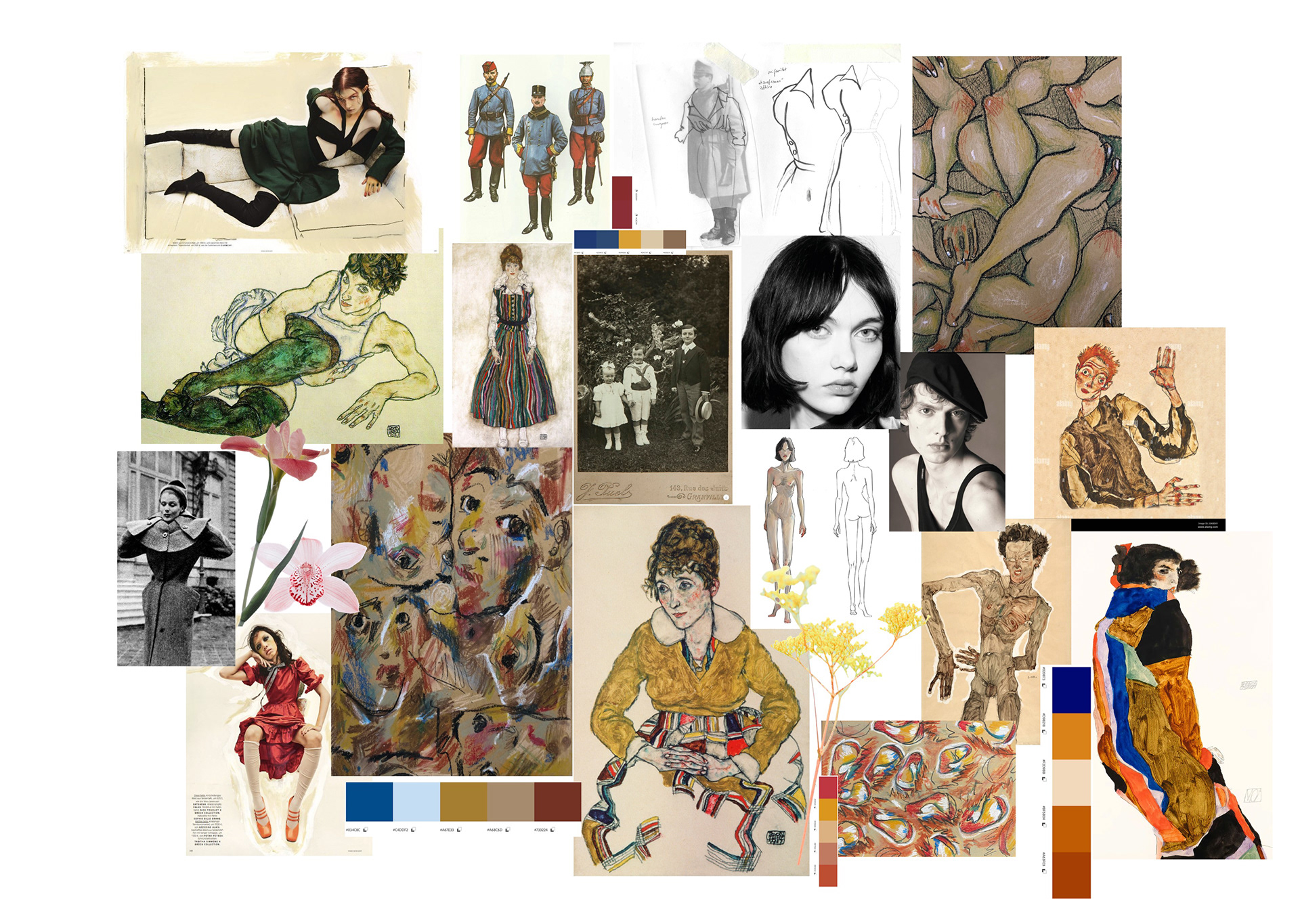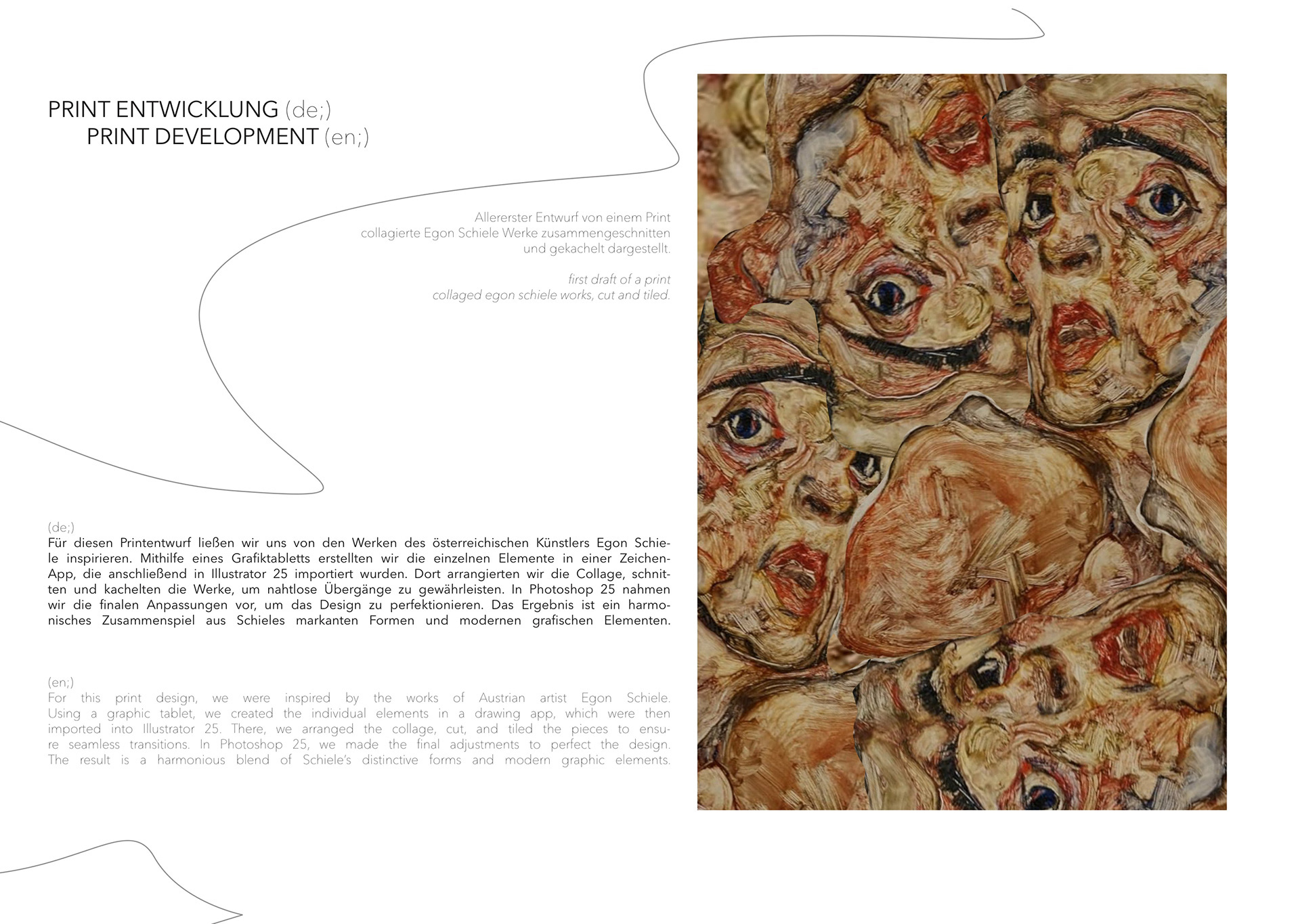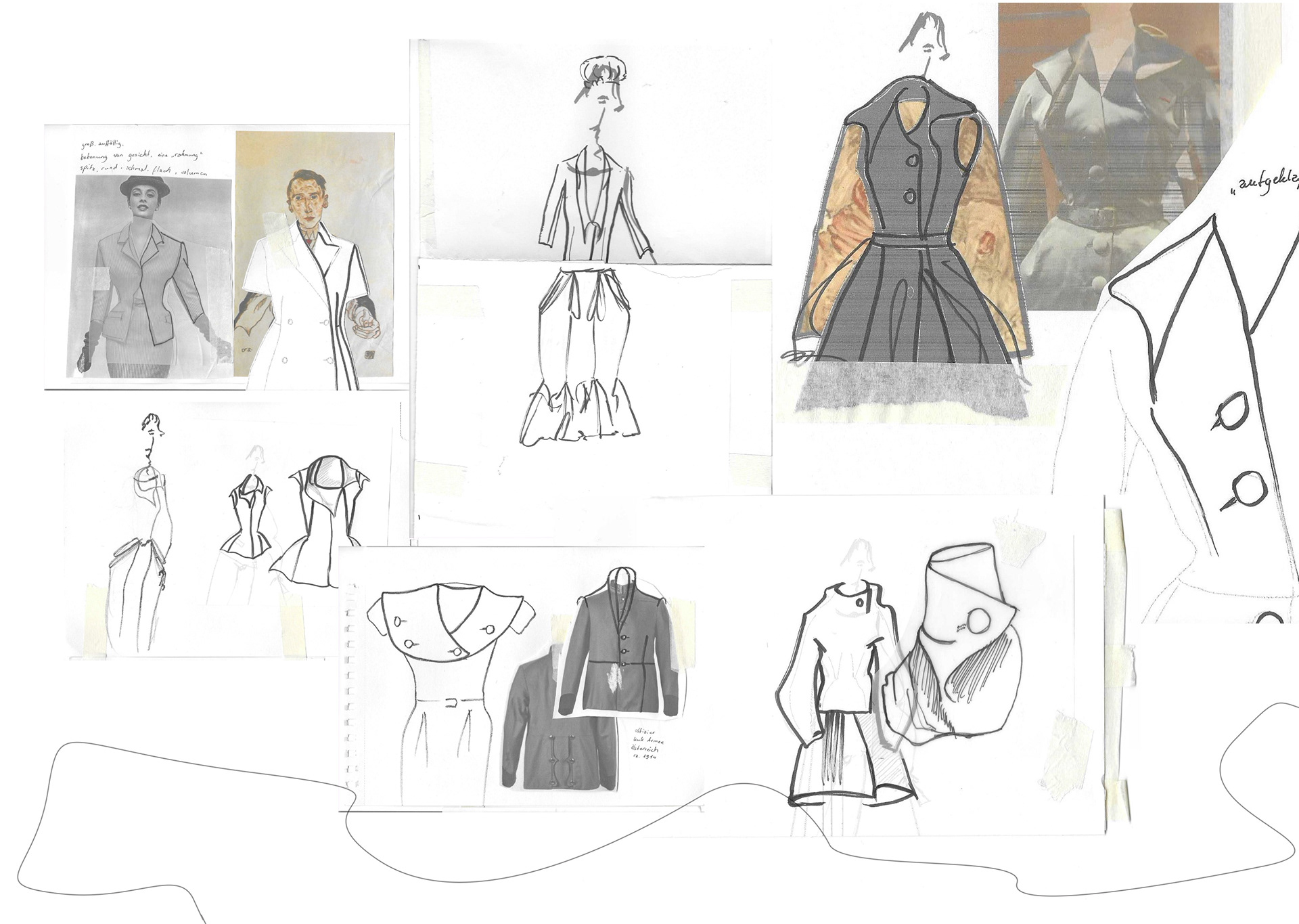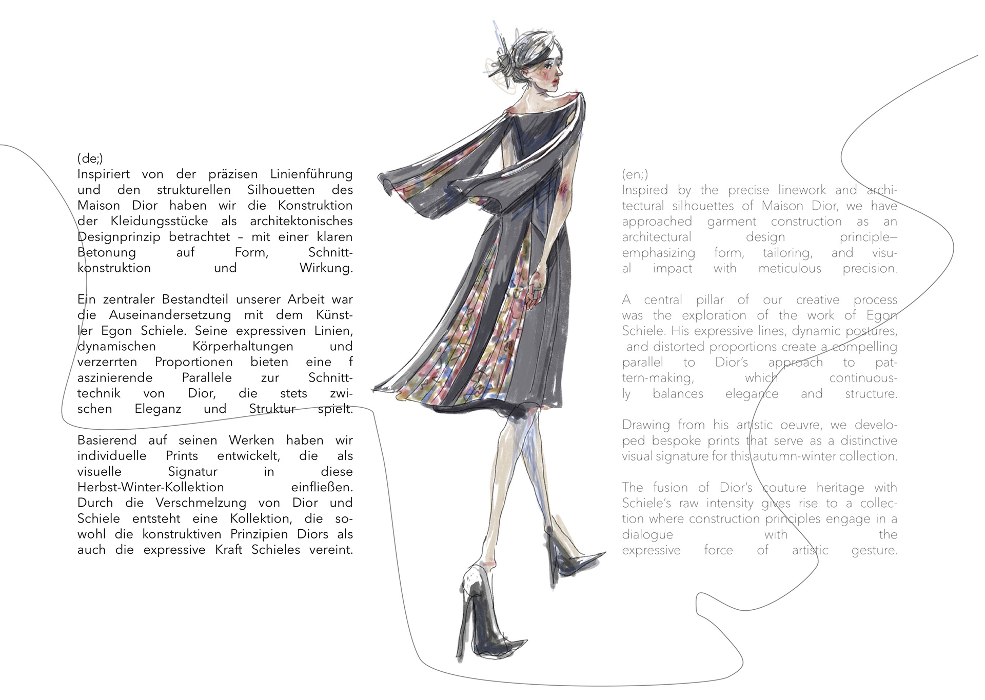 A Project based on a combination of The Works of Egon Schiele and the Silhouettes of Christian Diors „The New Look“ We produced New Silhouettes, Fashion Illustrations, Print and Accessoires Designs.